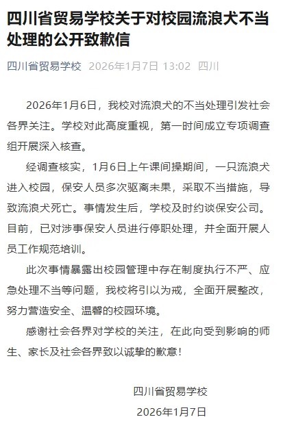 1月7日嘉正网,四川省贸易学校发布关于对校园流浪犬不当处理的公开致歉信: